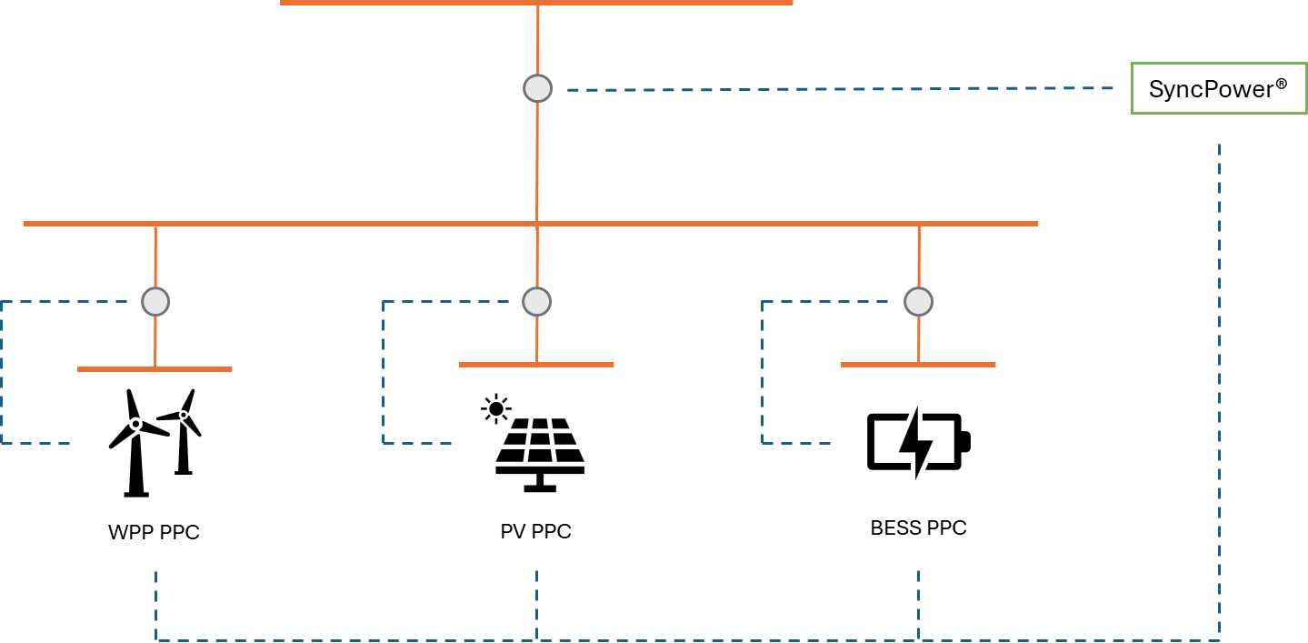 Connecting a hybrid power plant to the electricity grid requires following the transmission system operator’s guidelines. High-level voltage control is carried out using a software solution that manages the operation of the hybrid power plant. As shown in the image below, the software responsible for high-level voltage control operates between the electricity grid and the production units, where it: