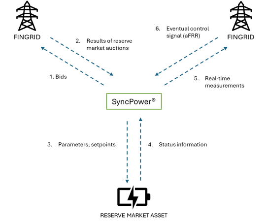 In practice, participating in reserve markets requires software that manages data exchange. For this purpose, Syncron Tech has developed the software solution shown in the image below. It acts as a data intermediary between the TSO and the reserve resources, handling the following functions: